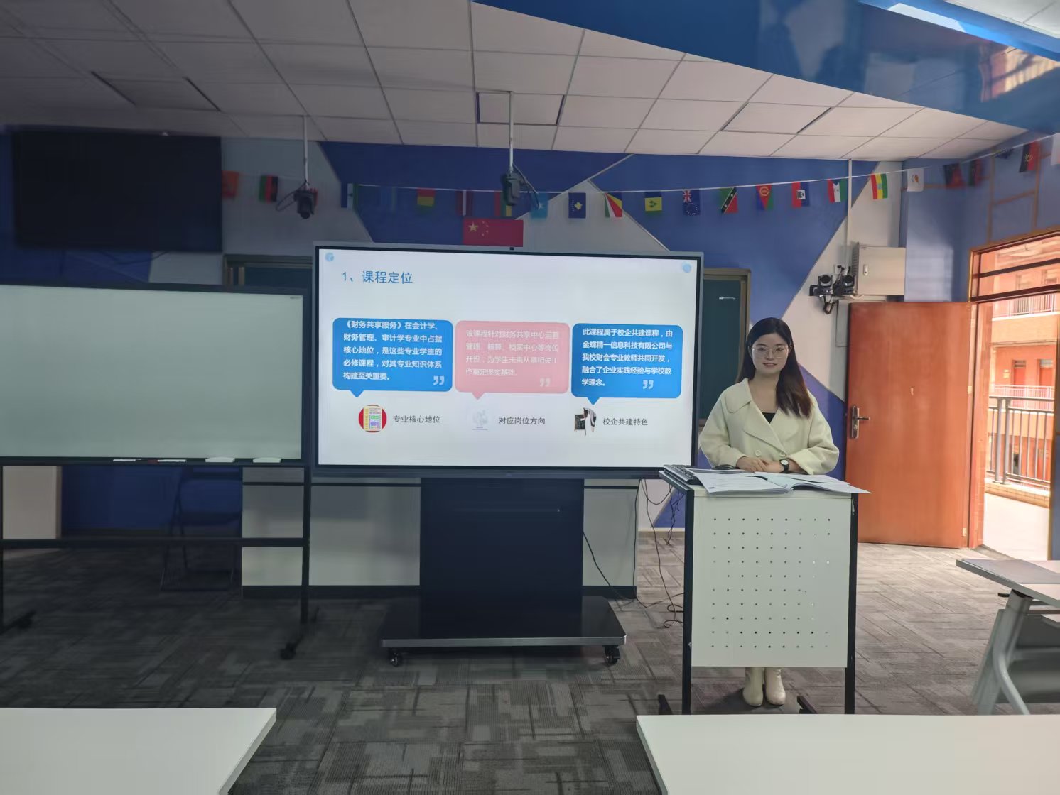 罗珈欣老师在说课环节,简要介绍财务共享服务课程内容,然后深入阐述课程设计和教学学情方面的特征,展现出对课程整体架构的深刻理解和把握。