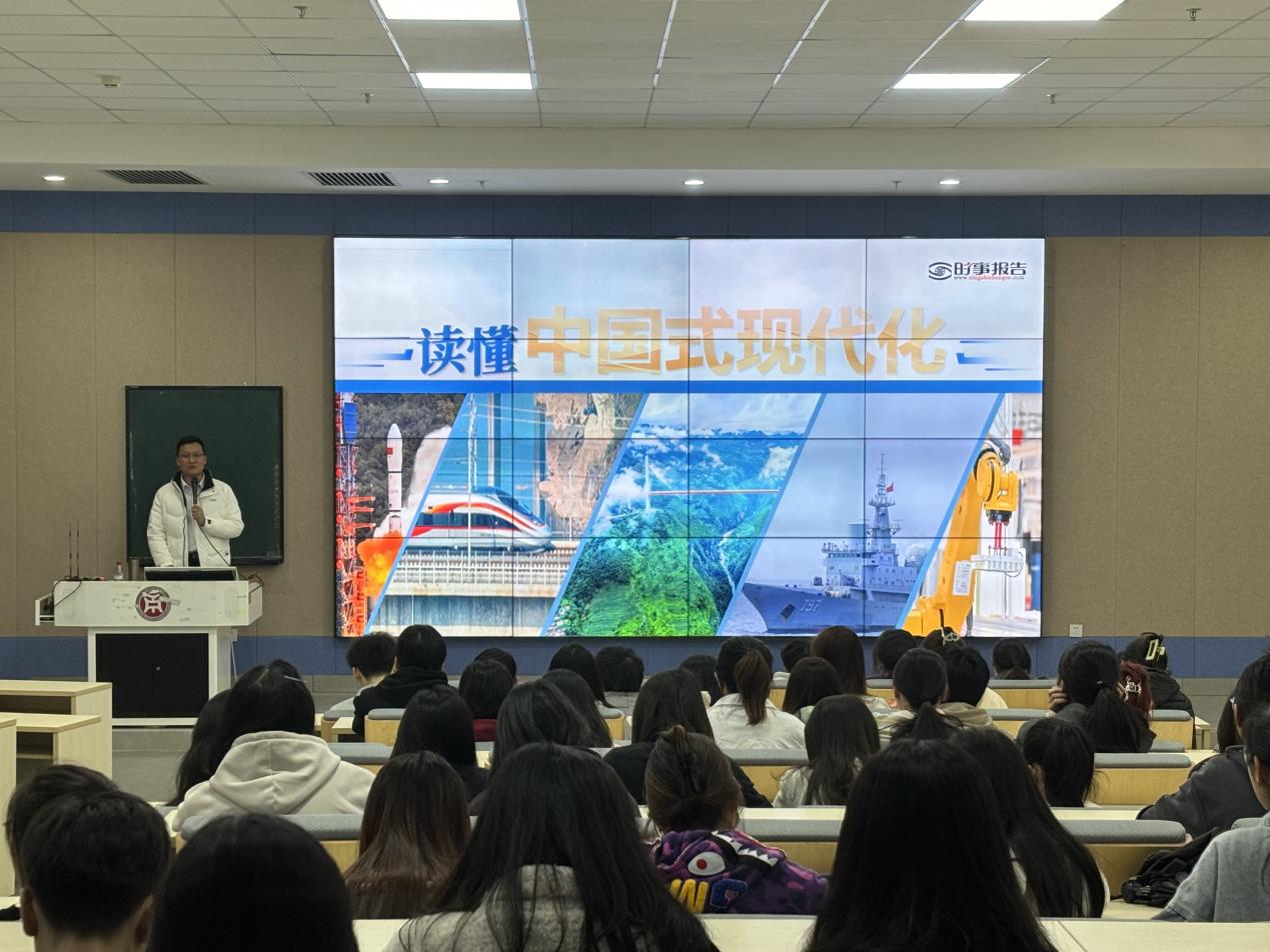为深入学习贯彻习近平新时代中国特色社会主义思想和党的二十大精神,让思政教育贯穿于大学生教育的全过程,扎实推进党的创新理论进校园、进课堂、进学生头脑,提高学生的思想政治意识。2024年3月12日会计学院党委组织学院青年学生代表在肇庆校区8号楼开展以《读懂中国式现代化》为主题的思政第一课,引导学院青年听党话、感党恩、跟党走。本次授课主讲人为会计学院党委副书记陈洋广同志。