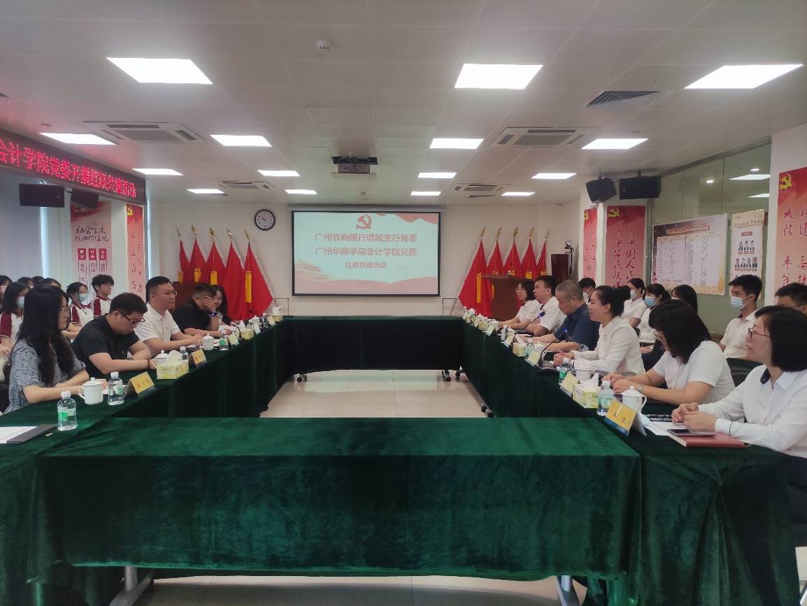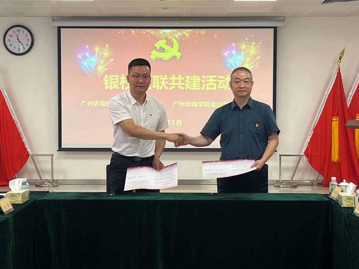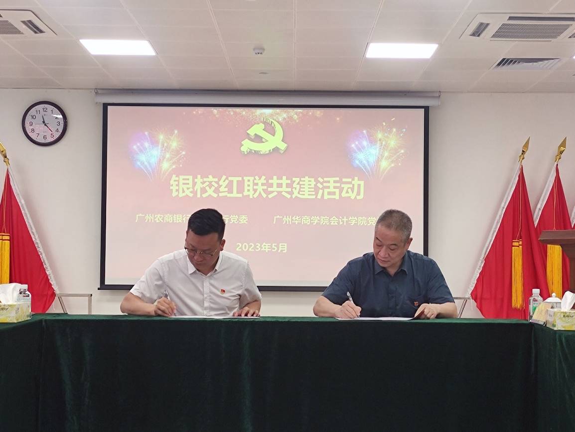 2023年5月26日,会计学院党委和广州农商银行增城支行(简称“农商行增城支行”)党委在合汇广场增城农商行总部进行红联共建主题活动及签约仪式。本次活动是根据学习贯彻习近平新时代中国特色社会主义思想主题教育的要求,结合共建双方实际,实现资源共享、优势互补、互助共建,促进党建与业务发展“同频共振”,开展“校银携手,合作共赢”为主题的红联共建工作。广州农商银行增城支行党委副书记纪委书记赵明、党委委员兼行长助理谢超颖、党委委员兼零售业务部经理田春雷,会计学院党委副书记陈洋广、党委委员兼副院长周书域、学院学工副主任兼党支部书记杨烨瀚等领导出席活动。农商行增城支行部门经理、员工党员代表,会计学院部分党支部书记、20名学生党员代表共同参加本次活动。