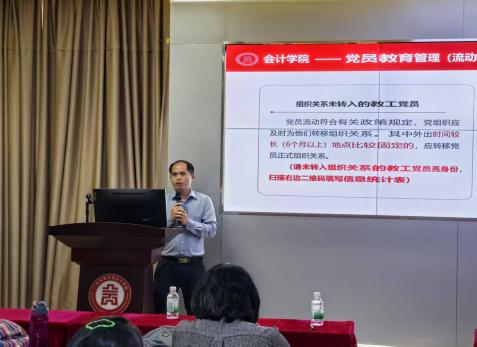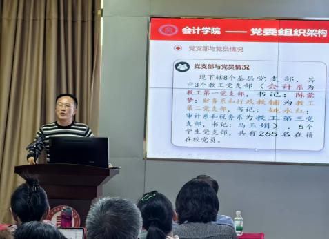 会议伊始,刘善球书记详细介绍了会计学院党委的组织架构,强调了全体教职工了解党委组织架构和工作分工的重要性。紧接着,刘书记回顾了近期党建工作开展情况,明确下一步工作重点,即党建工作要助力标杆院系的建设,推动标杆支部建设和双带头人工作,并结合实际情况提出了具体的建设目标。此外,刘书记还提到了要强化党员教育管理工作以及规范党组织活动考勤制度。最后,刘书记强调了“三会一课”的重要性,要求各支部围绕合格评估工作,加强对党员的思想教育,关心党员思想动态,促进学生学风养成。他希望全体党员要高度重视意识形态风险防范,始终保持高度的政治敏锐性和责任感,充分发挥党员先锋模范作用,为华商学院的合格评估和各项事业发展贡献智慧和力量。