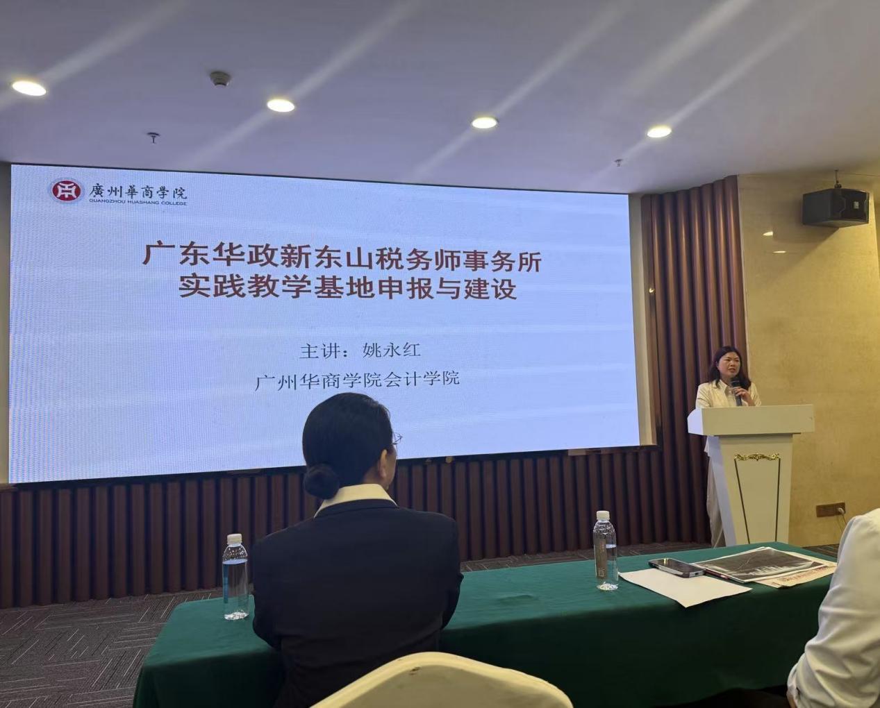 最后,广州华商学院会计学院财务系主任姚永红副教授就广东华政新东山税务师事务所有限公司大学生校外实践教学基地项目的申报与建设进行汇报。她详细介绍了基地建设的目标定位、功能布局及运行机制,明确了双方在学生实习管理、教学资源开发等方面的合作细则,为实践基地的规范化建设奠定了基础。
