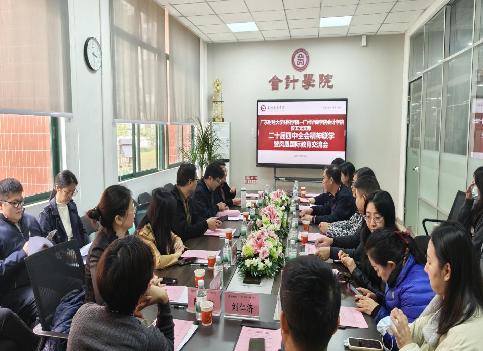 2025年11月20日,广州华商学院会计学院党委与广东财经大学财政税务学院党委开展“党的二十届四中全会精神联学暨凤凰国际教育交流会议”,此次会议以支部联学为纽带,创新理论学习与教育交流形式,为国际教育高质量发展搭建合作平台。凤凰国际教育董事兼总经理兼马来西亚双威学院驻中国首席代表吕资慧、副总经理李健、项目经理汪雨杭、广州国际人才交流协会主任秦亚慧,广东财经大学财政税务学院党委书记刘文基、副院长朱翠华、支部书记邝艳华、财税系副主任于井远及教师代表丁宇红、刘仁济、陈超阳,广州华商学院会计学院党委委员、院长姚凤民、教师第一党支部书记、院长助理陈蒙梦、院长助理陈平、会计系主任唐丽华、党委委员、学工办主任杨烨瀚及教工第一党支部教师代表共同参会,会议由会计学院教工第一党支部书记、院长助理陈蒙梦主持。