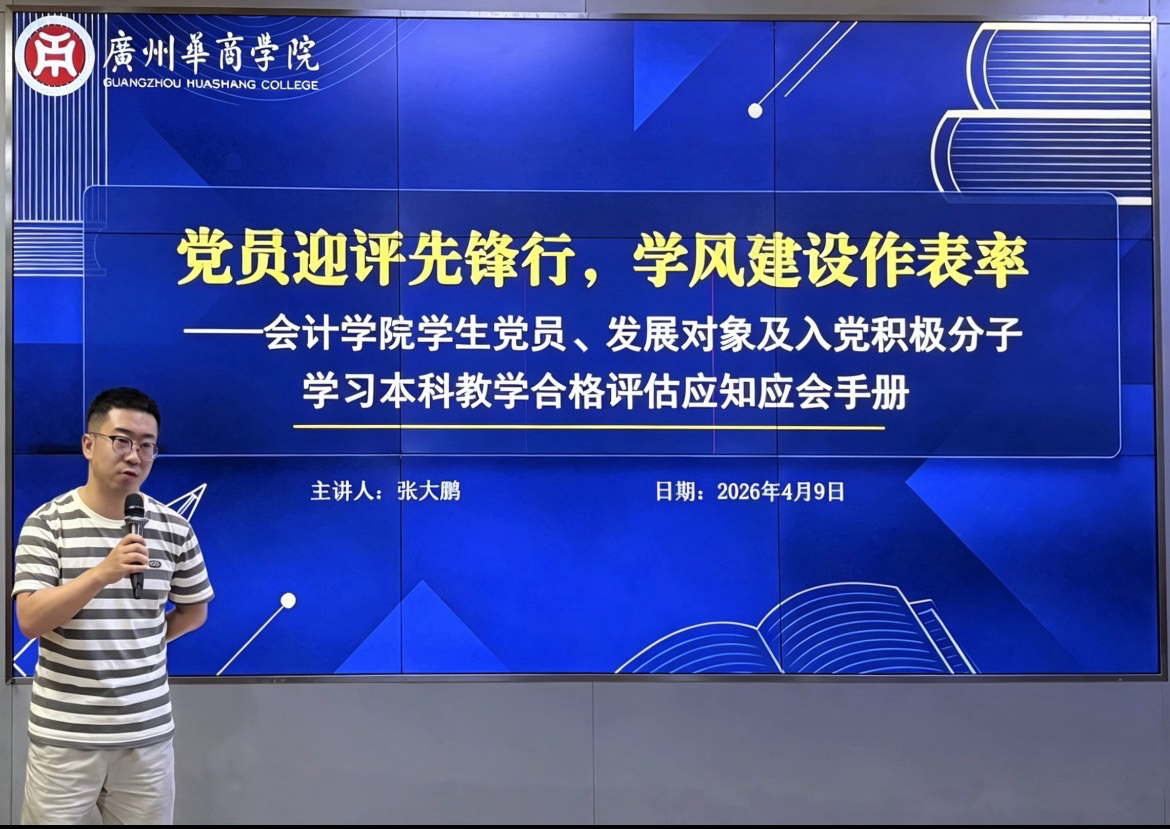 为扎实推进本科教学合格评估工作,充分发挥学生党员先锋模范作用,以高质量党建引领高质量学风,2026年4月9日,会计学院党委召开“党员迎评先锋行・学风建设作表率”本科教学合格评估工作动员大会暨应知应会手册专题学习会。学院党建组织员张大鹏出席会议,广州校区学生党员、发展对象及入党积极分子参会,会议由罗毓璘同志主持。