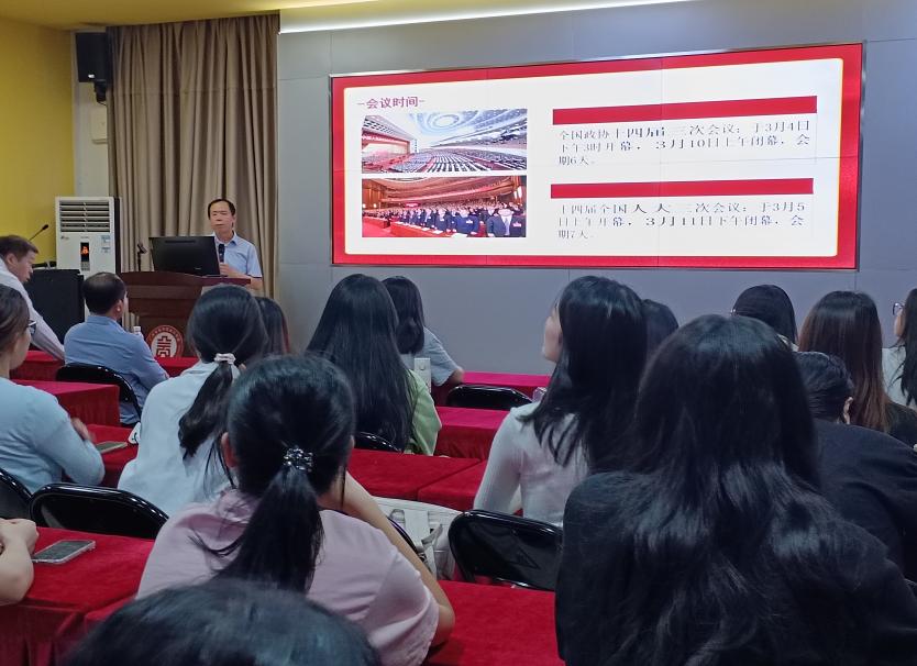 姚院长为学生们解读了全国两会中关于经济增长、科技创新、乡村振兴等热点议题,强调会计人应紧跟国家发展步伐,以专业力量服务国家战略。姚院长指出,会计人作为经济发展的重要参与者,需在新质生产力与智能会计领域发挥关键作用。他勉励学生掌握数据建模、AI审计等技能,适应数字化转型需求,同时坚守诚信底线,以真实数据为政府决策提供支持。同时要求会计人应从“记账员”向“战略决策支持者”转变,运用财务数据分析助力企业战略制定,促进区域协调发展,助力共同富裕目标实现。