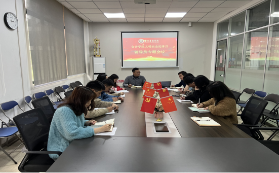 为了营造文明、和谐、幸福的校园氛围,深入学习贯彻习近平新时代中国特色社会主义思想,用社会主义核心价值体系引领校园思想文化弘扬中华民族传统美德,进一步加强大学生思想道德、全面提高大学生素质,增强纪律观念、安全防范意识,帮助同学们养成良好的学习和行为习惯,建设和谐校园,3月13日下午,会计学院在会议室召开2024年“文明安全纪律教育月”辅导员专题会议。