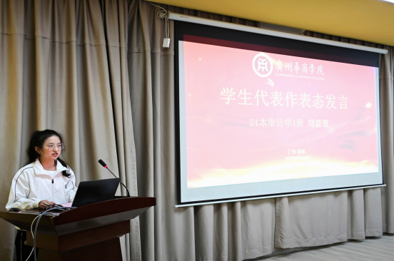 学工办副主任杨烨瀚对会计学院文明安全纪律月活动进行工作部署。21本审计学1班刘嘉慧和22本税收学班李佩虹作为学生代表进行表态发言。他们表示要树立正确的价值观,养成良好的行为习惯,积极传播正能量影响和带动身边的人,带头敢于担当,对违反文明和纪律的行为进行劝阻和制止。
