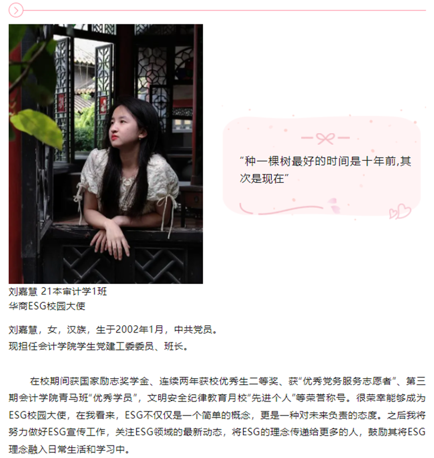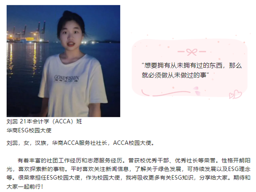 随着ESG行业的蓬勃发展与各项制度的逐步落实,在标准编制、理念推广、信息披露等方面将面临大量的ESG专业人才缺口。华商教育集团、华商会计学院高度重视ESG人才培养。为进一步推进ESG人才培养各项工作开展,举办了第一届广州华商学院ESG校园推广大使评选活动。随着校园大使评选落下帷幕,来自会计学院的刘佳慧、刘蕊同学,国际学院的劳雅怡同学脱颖而出。在接下来的活动中,他们将承担各项工作任务,一展风采。