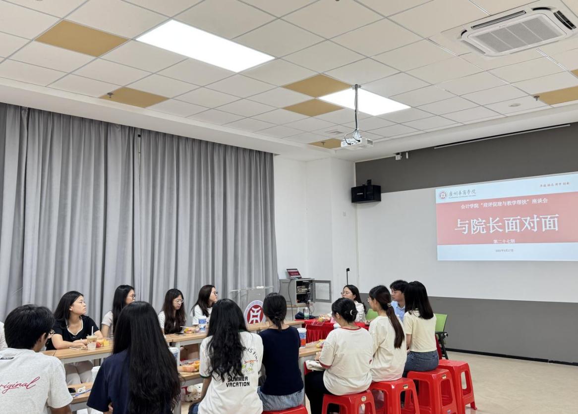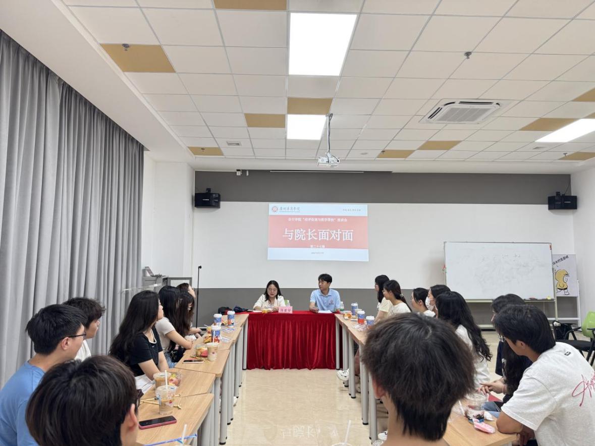 2025年6月17日下午,会计学院第27期“与院长面对面”座谈会在肇庆校区6号楼会议室顺利举行。本次座谈会由会计学院院长助理陈蒙梦老师主持,辅导员胡俊老师与23级15名学生代表共同参与,围绕学校评估工作与学业发展规划进行了深入交流。