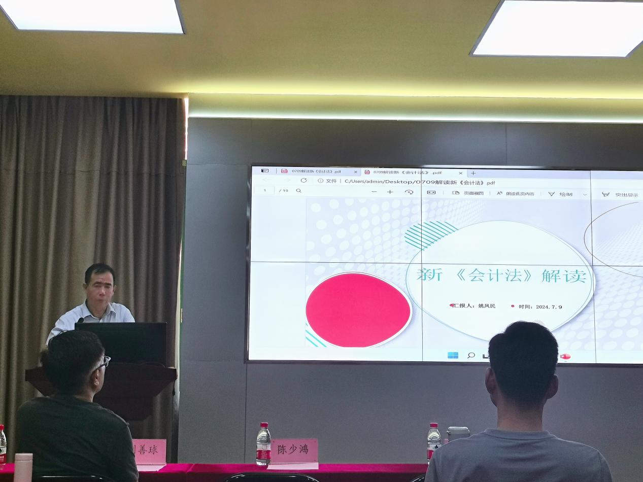 《全国人民代表大会常务委员会关于修改(中华人民共和国会计法)的决定》已由中华人民共和国第十四届全国人民代表大会常务委员会第十次会议于2024年6月28日通过,自2024年7月1日起施行。2023年12月29日,十四届全国人大常委会第七次会议表决通过新修订的《公司法》,自2024年7月1日起施行。为积极响应国家法治建设号召,深入贯彻新修订的《中华人民共和国会计法》与《公司法》精神,2024年7月9日,会计学院组织全体教师专题学习新《会计法》与新《公司法》,由会计学院院长姚凤民教授和副院长刘善球教授分别解读新《会计法》和新《公司法》的影响和意义,本次专题学习会由会计学院院长助理陈蒙梦主持。