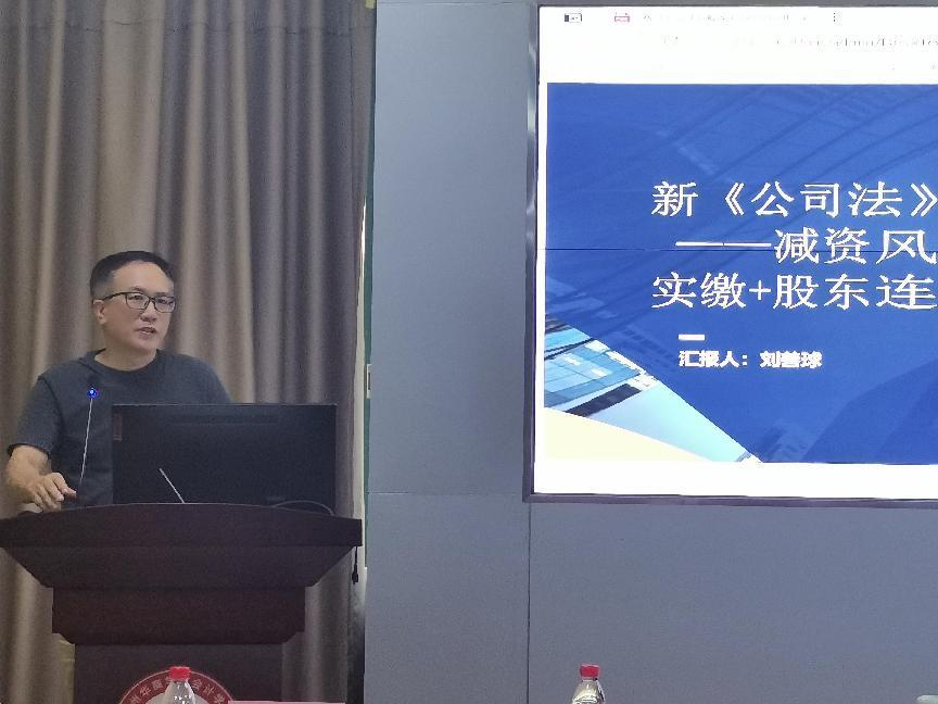 接下来,会计学院副院长刘善球教授对新《公司法》进行解读。他从专业的角度深入分析了新公司法在减资风险和股东连带责任界定等方面的变化。这些变化旨在加强公司注册资本管理,保护债权人利益,促进公司稳健发展。他鼓励教师们要深入研究新法,将其与教学实践相结合,提升学生的法律素养和解决实际问题的能力。