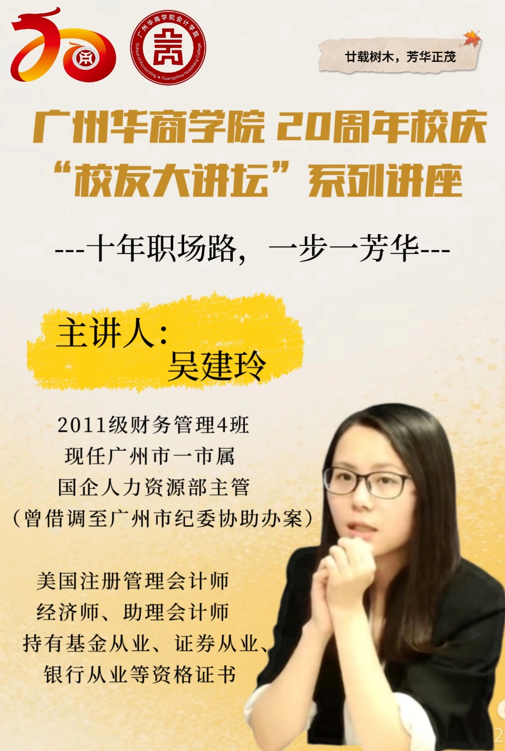 2025年12月26日14:00,广州华商学院会计学院20周年校庆系列活动之“会计校友大讲堂”(第11期)在学院报告厅举行。本次校友大讲堂邀请到了广州市某市属国企人力资源部主管吴建玲(2015届毕业生)为我院100余名师生带来了一场以“十年职场路,一步一芳华”为主题的经验分享。本次大讲堂由会计学院辅导员张大鹏主持。