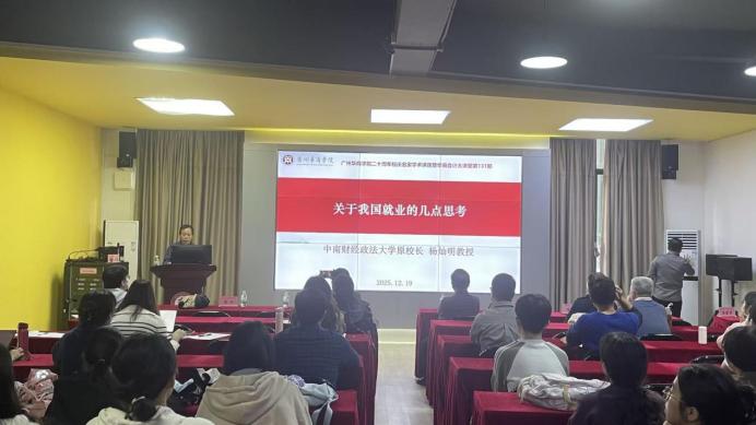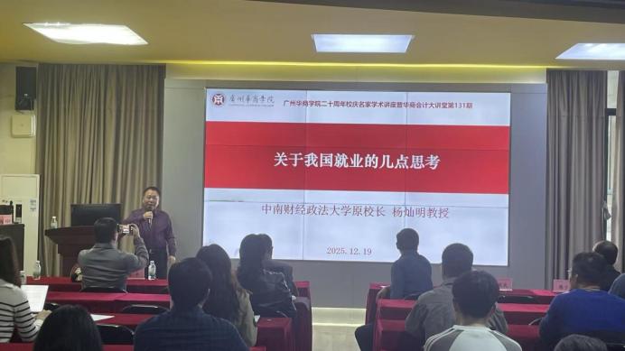 弦歌不辍二十载,筑梦扬帆启新程。2025年12月19日,值广州华商学院二十周年校庆之际,著名经济学家、中南财经政法大学原校长杨灿明教授应邀为我院师生开展题为《关于我国就业问题的几点思考》的校庆专题讲座暨华商会计大讲堂第131期,帮助师生精准把握当前就业形势,明晰职业发展方向。讲座由会计学院党委书记、院长姚凤民教授主持,学院师生代表一百余人参与本次讲座。