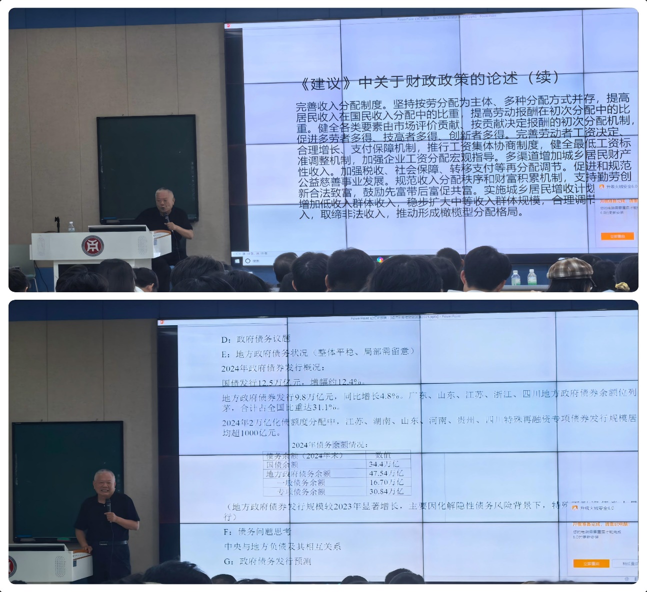 王朝才教授立足国家经济发展大局,围绕“经济形势总体判断”“面临的结构性挑战”“发展战略与政策方向”等方面展开系统阐述。他指出,中国经济“基本盘”稳固,2024年GDP预计超134万亿元,粮食产量保持稳定,仍是世界经济增长的重要动力。同时,他也深入剖析当前经济面临的“爬坡过坎”压力、“卡脖子”技术制约、区域发展不平衡、房地产等行业调整等结构性挑战,引导师生辩证看待当前经济形势。
