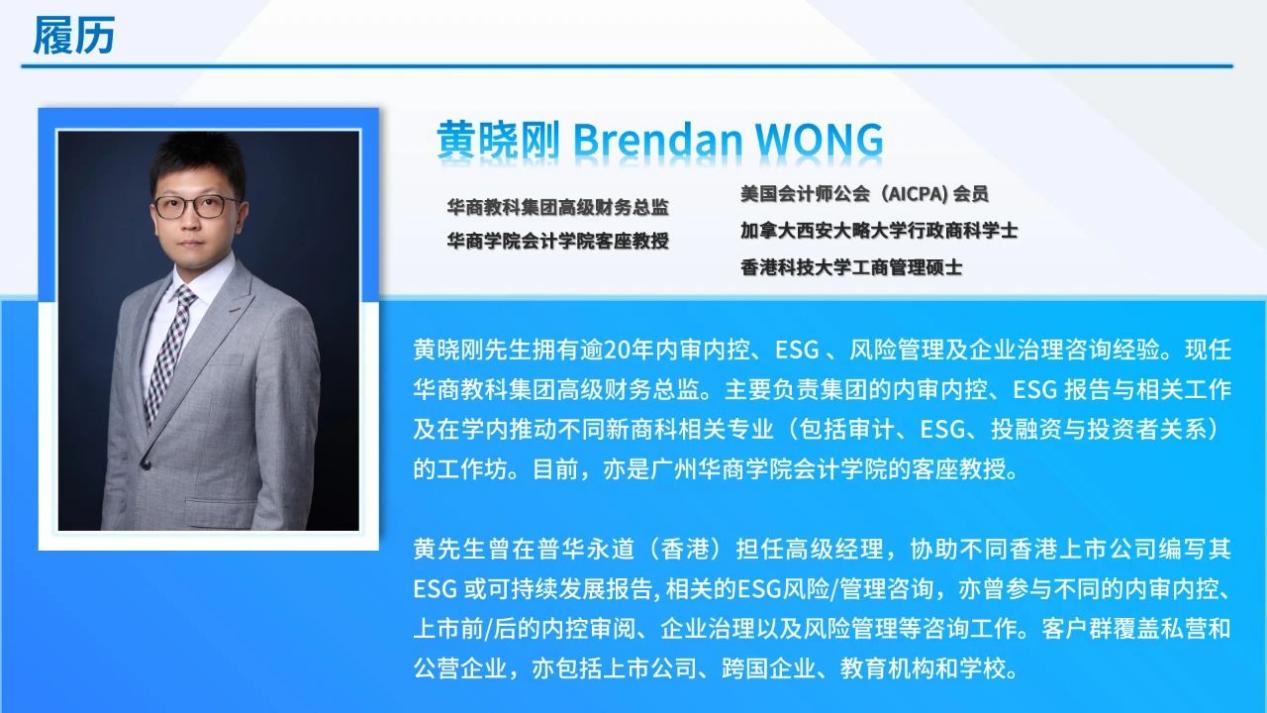 带着这些思考,安华理达非常荣幸邀请广州华商学院“IR及信用管理工作坊”的项目带头人黄晓刚老师 Brendan,为大家揭秘合作背后的故事,共同探索校企融合下IR及信用管理人才培养的新模式!Brendan老师在内审内控、ESG、风险管理及企业治理咨询领域拥有逾20年经验,现任华商教科集团高级财务总监,亦是广州华商学院会计学院客座教授,曾助力多家香港上市公司开展风控、ESG等相关工作。