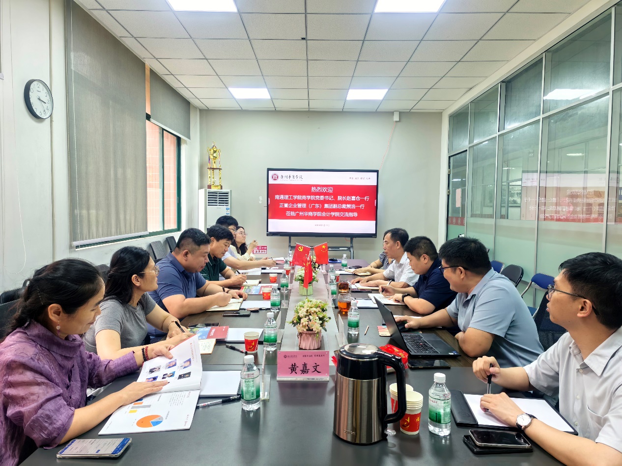 2025年9月19日,正誉企业管理(广东)集团股份有限公司副总裁熊浩、南通客户合伙人马彩芹携南通理工学院商学院党委书记、院长赵喜仓,南通理工学院商学院实验室与设备管理处处长陈国良,商学院副院长林小芳,商学院财务管理教研室主任吕延荣一行7人来访我院交流产教融合工作。广州华商学院会计学院院长姚凤民、副院长周书域、院长助理陈蒙梦、数智会计与商务服务产业学院副院长范卫星热情接待了赵喜仓院长一行。