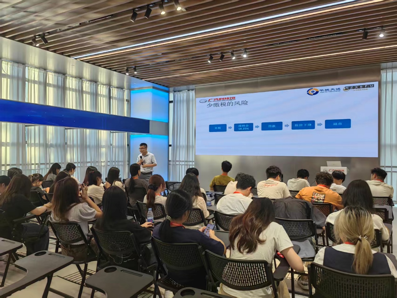 广汽科技馆参观完毕后,易税易行税务师事务所的黄杨易总经理为同学们带来了一场题为“从绝味鸭脖案例看财税合规重要性”的主题讲座。黄杨易总经理以知名上市公司绝味鸭脖公司因虚假记载于9月23日被湖南证监局行政处罚、公司股票也因此被实施其他风险警示的最新案例作为导入,为同学们生动剖析了企业在跨区域经营、供应链布局、税收优惠适用等方面的应采取的管理策略与风险防控手段。随后,黄经理从实务角度出发,引导学生将税收理论置于真实商业场景中理解,并强调:“税务管理不仅是合规要求,更是企业战略的重要组成部分。从制造业到快消业,税收筹划与风控意识贯穿企业生命全周期。”